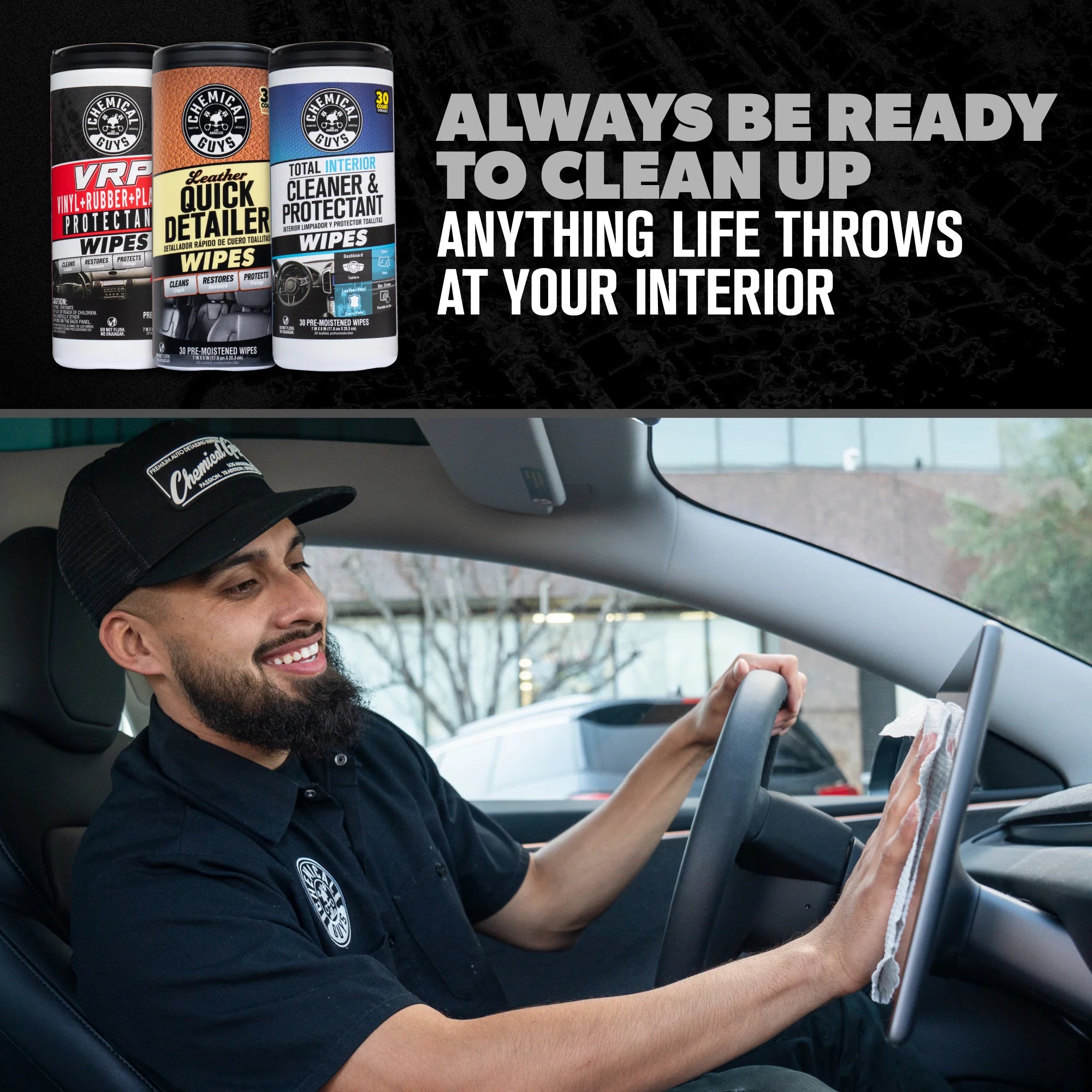 If you're looking for an easy and effective on-the-go way to keep your car's interior spotless and protected, the Chemical Guys Canister Wipes Kit is just what you need. With Total Interior Wipes, you can achieve a clean, original-looking finish while protecting surfaces from daily wear and tear. VRP Wipes offer restorative protection, preventing cracking and fading on vinyl, rubber, and plastic. Leather Quick Detailer Wipes bring back the supple feel of your leather surfaces and guard against cracking and fading, ensuring your interior looks and feels its best.