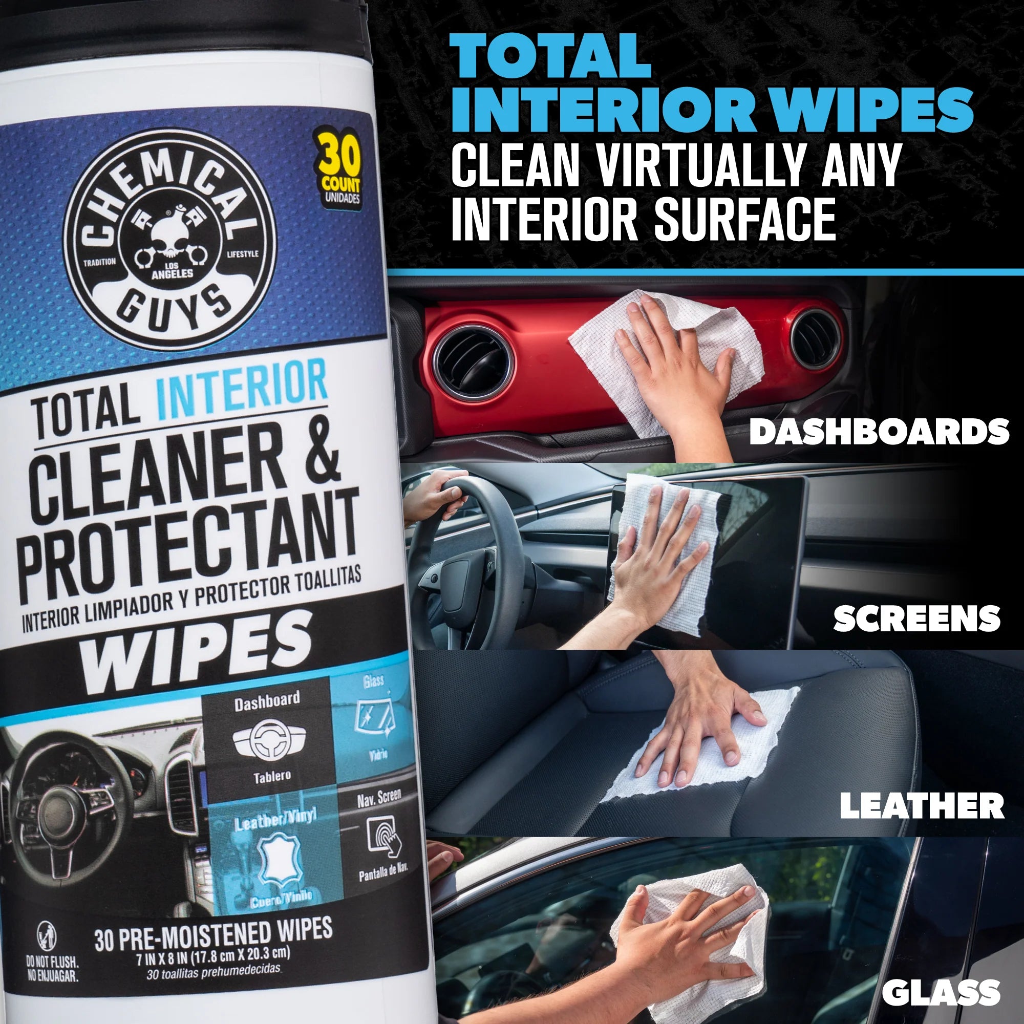 Use Total Interior Wipes on virtually any of your interior surfaces, including the dashboard, navigation screen, door panels, and center console. Wipe down each area thoroughly to remove dust, dirt, and grime. Make sure to use gentle, circular motions to avoid streaks, especially on screens. Allow the surfaces to dry naturally, leaving a clean, original finish.