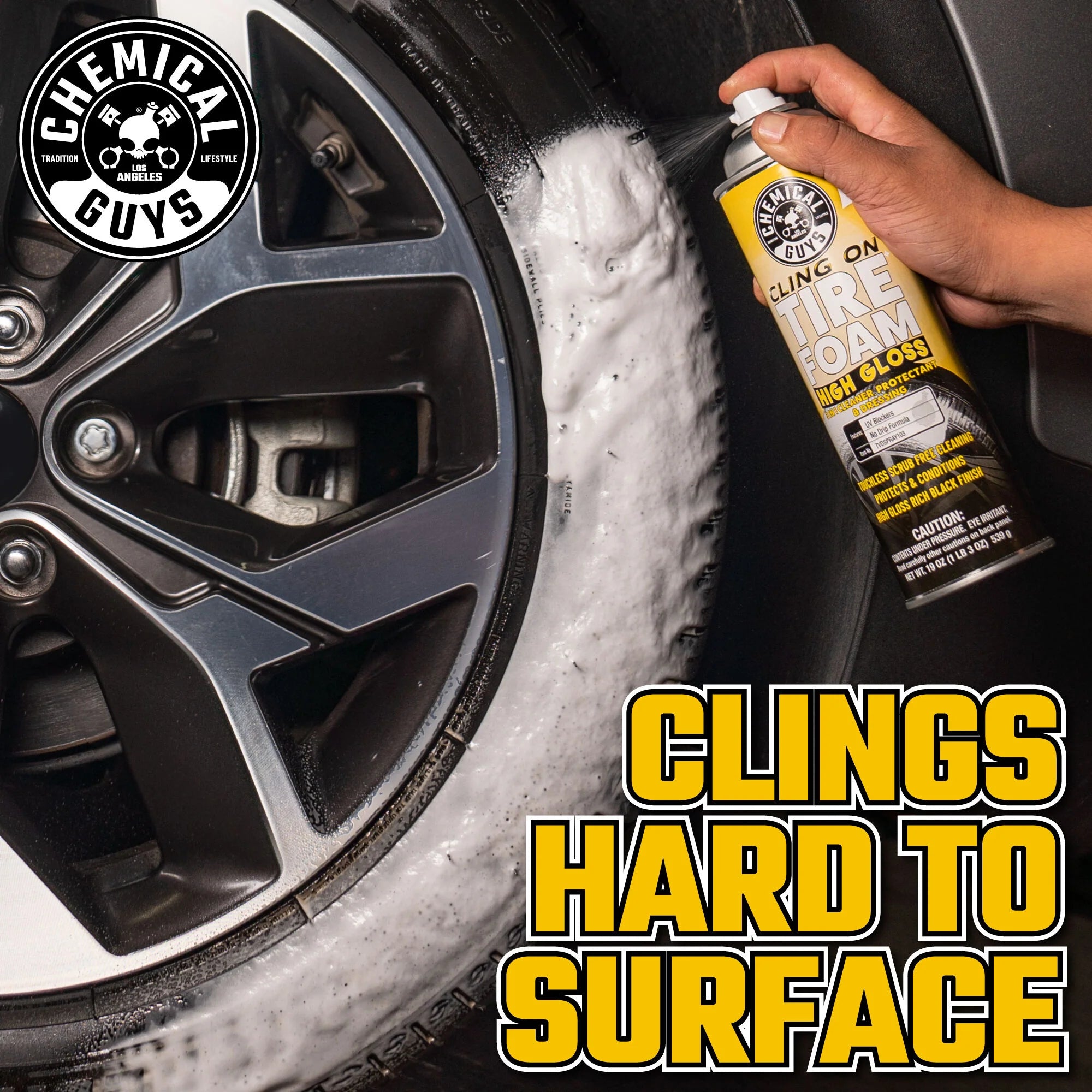 Always ensure the wheels and brakes are cool before you use this product. Shake Cling On Tire Foam and spray evenly onto your tire, holding it 5-10 inches away.