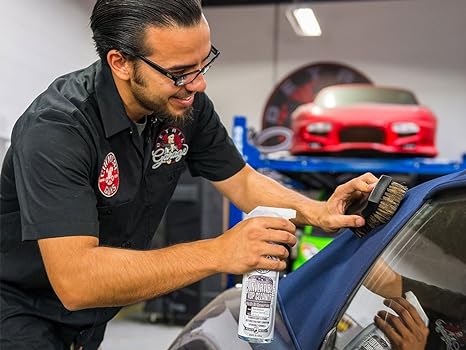 Shake well and spray the Convertible Top Cleaner directly onto the dirty convertible top. Scrub synthetic fabrics and vinyl soft tops well with the Convertible Top Brush. Wipe off any residue with a clean microfiber towel. Follow up with the Convertible Top Protectant and Repellent.