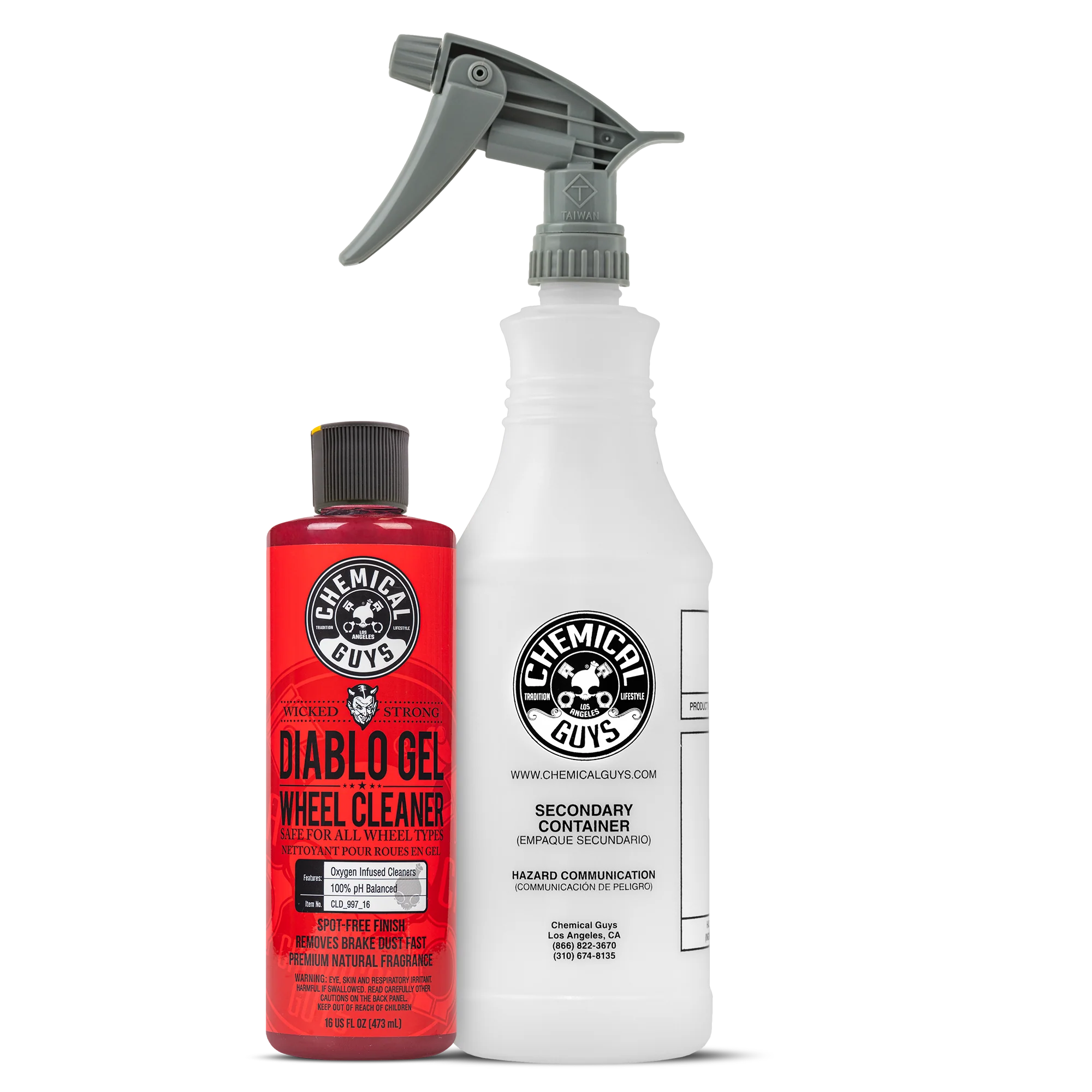 Unleash the ultimate in wheel-cleaning power with the El Diablo Spray Bundle! This kit features the legendary Diablo Wheel Cleaner—a pH-balanced, non-caustic formula designed to protect and preserve your wheels' pristine finish. For added convenience, we’ve included a refillable spray bottle, making your detailing routine smoother than ever.