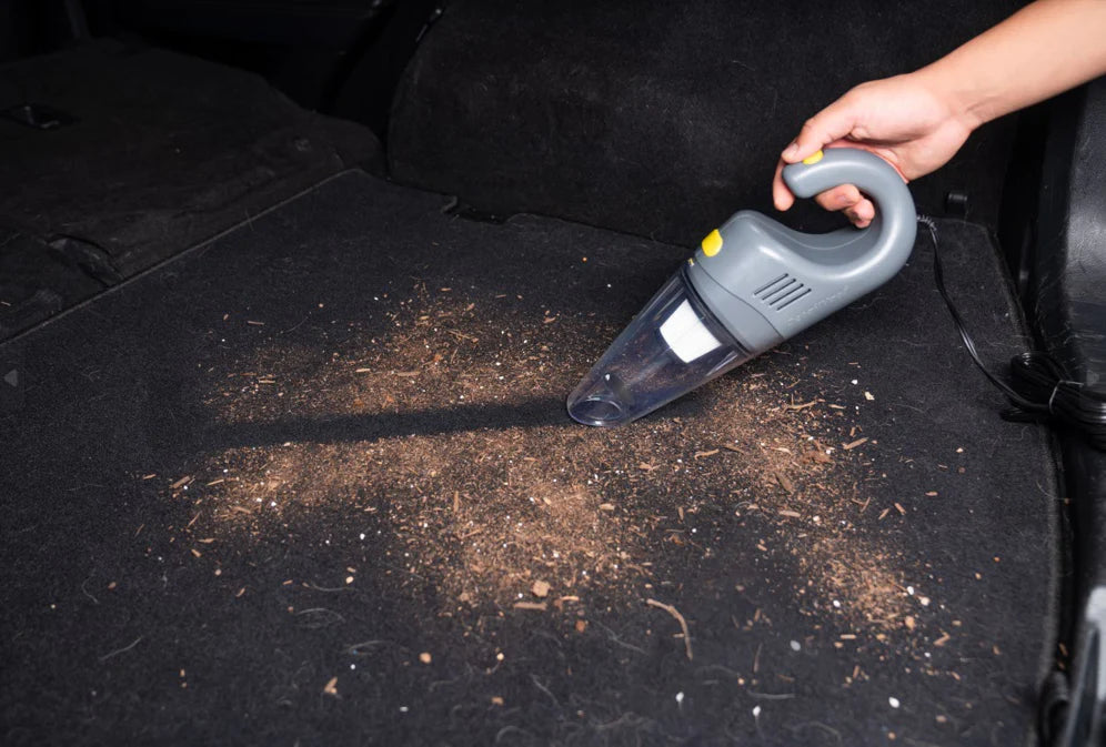 Begin by removing any large debris and pet hair from the seats and carpets using a vacuum cleaner with a brush attachment.