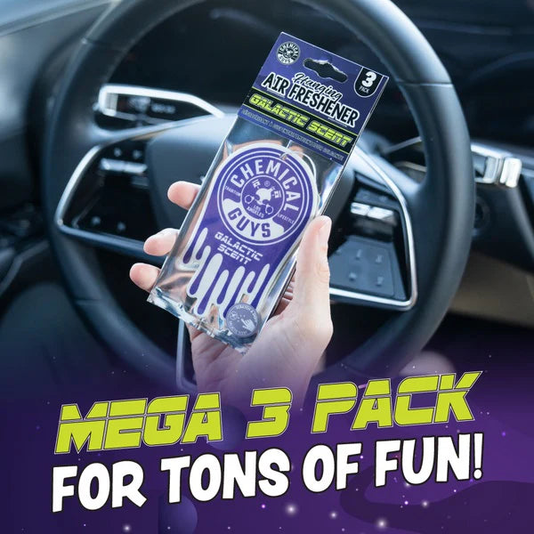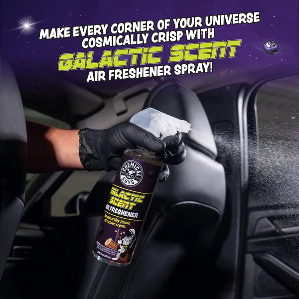 Blast off to new heights of scent satisfaction with Chemical Guys Galactic Scent Air Freshener. This exhilaratingly crisp, woodsy scent is specially formulated to transport you to an exotic-smelling intergalactic oasis, far away from any bad smells you may encounter in your ride's interior. A set of three hanging air fresheners adds a touch of swagger to your car, truck, SUV, or RV’s interior. Use the 16 oz spray in your car's interior, home, office, or anywhere you want a quick burst of Galactic Scent’s uniquely refreshing fragrance. Turn every ride into a thrilling (and great smelling) adventure into the cosmos with Chemical Guys Galactic Scent Air Freshener!