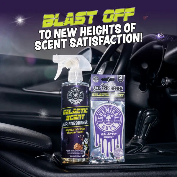 Blast off to new heights of scent satisfaction with Chemical Guys Galactic Scent Air Freshener. This exhilaratingly crisp, woodsy scent is specially formulated to transport you to an exotic-smelling intergalactic oasis, far away from any bad smells you may encounter in your ride's interior. A set of three hanging air fresheners adds a touch of swagger to your car, truck, SUV, or RV’s interior. Use the 16 oz spray in your car's interior, home, office, or anywhere you want a quick burst of Galactic Scent’s uniquely refreshing fragrance. Turn every ride into a thrilling (and great smelling) adventure into the cosmos with Chemical Guys Galactic Scent Air Freshener!
