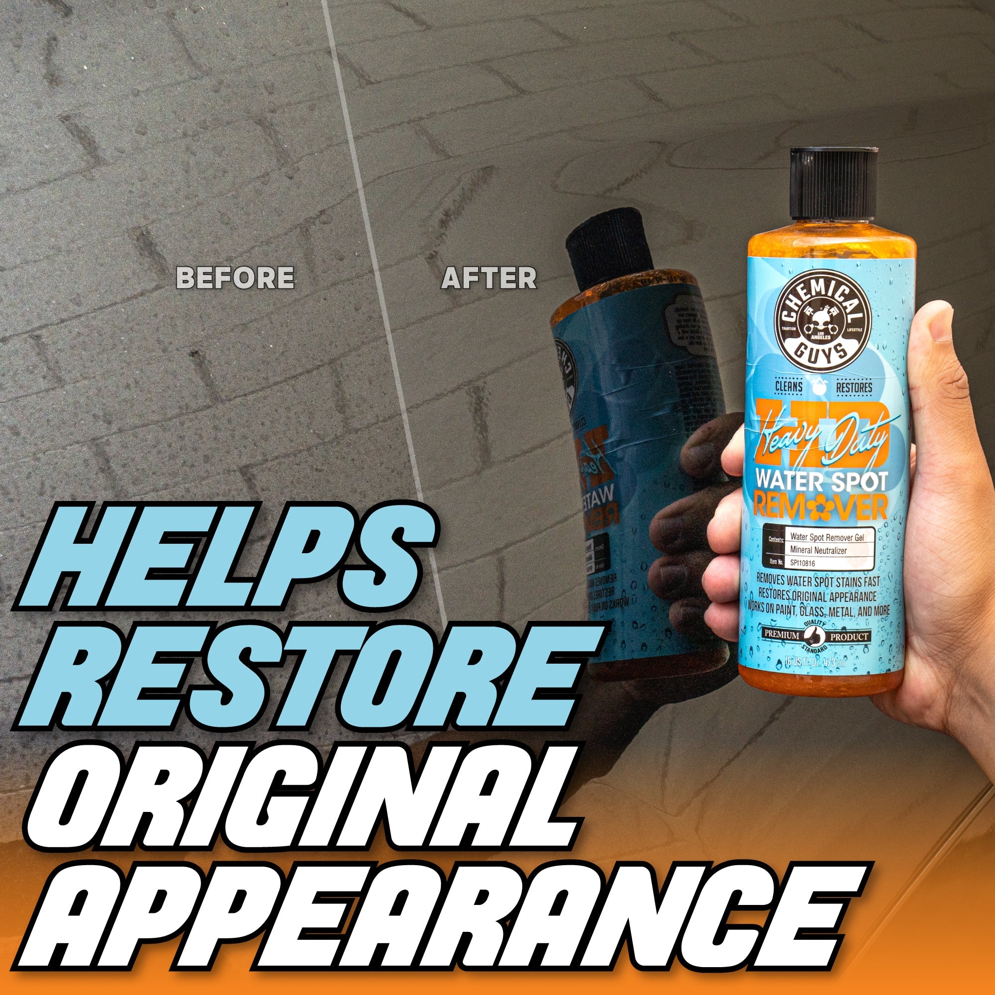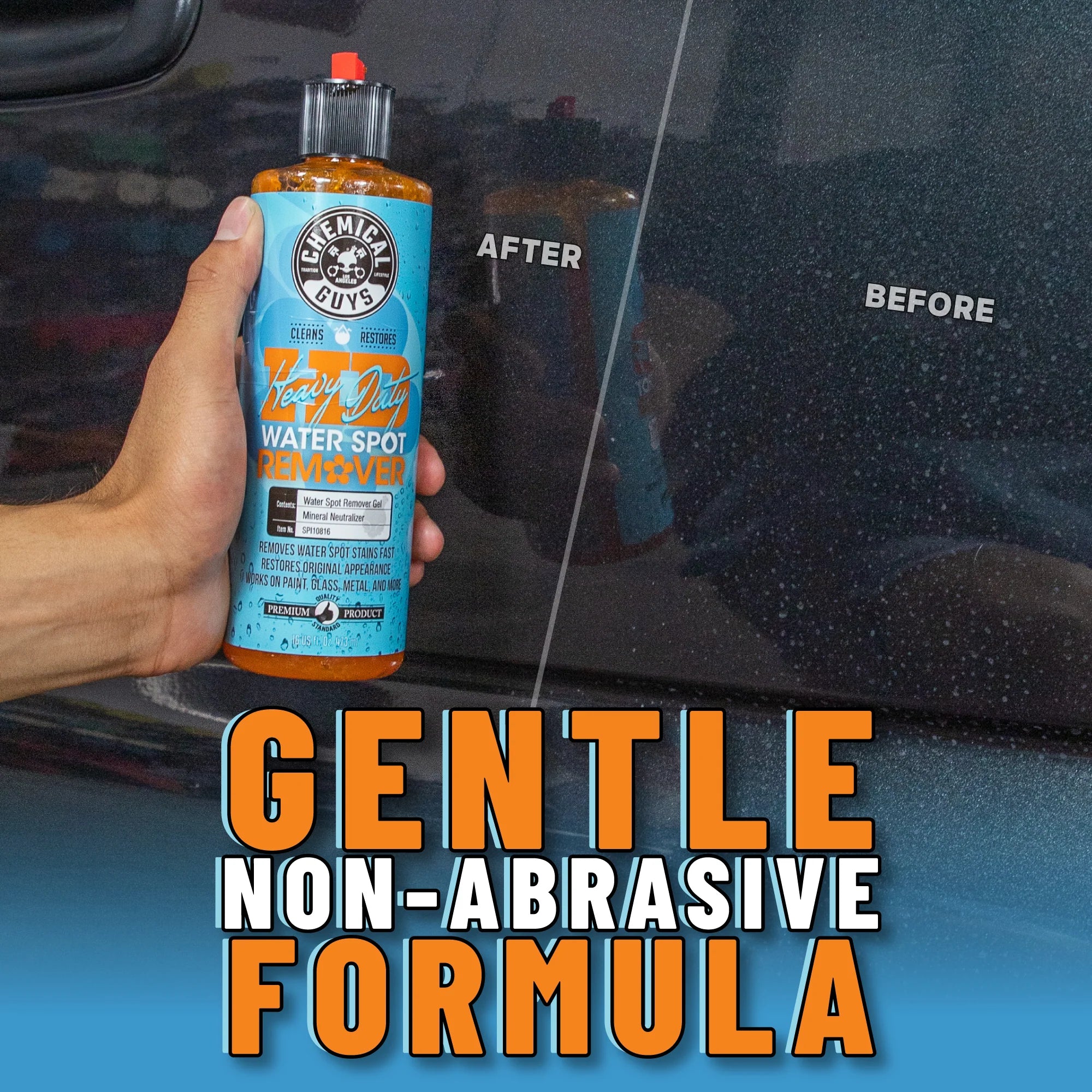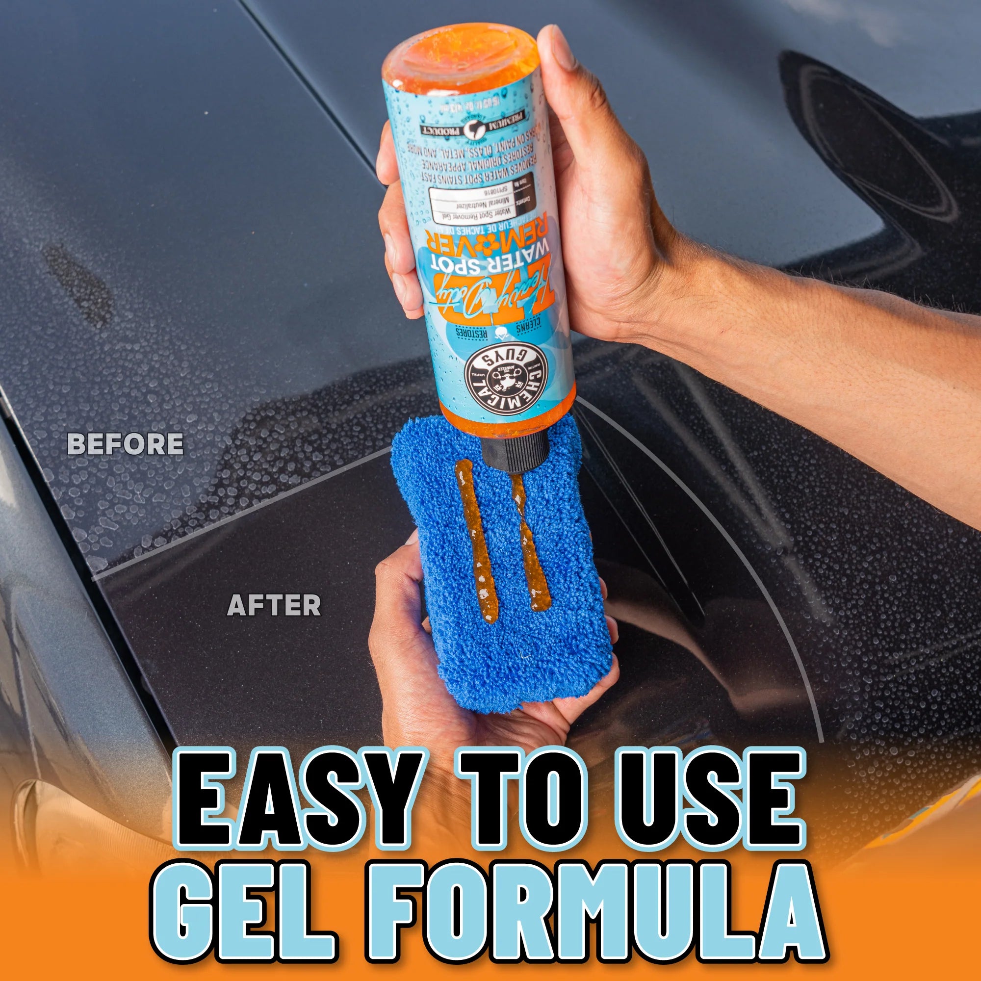 Heavy Duty Water Spot Remover is a specially formulated gel that tackles tough water stains and hard water spots. Its easy application makes it perfect for various surfaces, ensuring a streak-free finish. Use Heavy Duty Water Spot Remover whenever you notice water stains or hard water spots on your vehicle's paint, glass, or other surfaces. It's especially effective after washing your car, as it can remove any residual spots that washing alone couldn't eliminate.