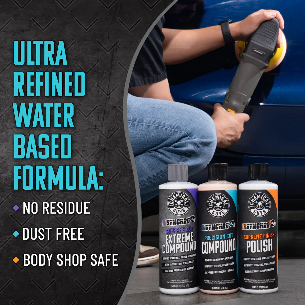 Elevate your detailing game with the InSynchro Core Cut & Shine Kit, made to achieve professional-grade results. This combination is designed to tackle everything, like deep imperfections, to achieve a flawless, mirror-like finish. Together, these three advanced paint correction/polishing compounds provide a comprehensive solution for restoring and enhancing your vehicle’s finish.