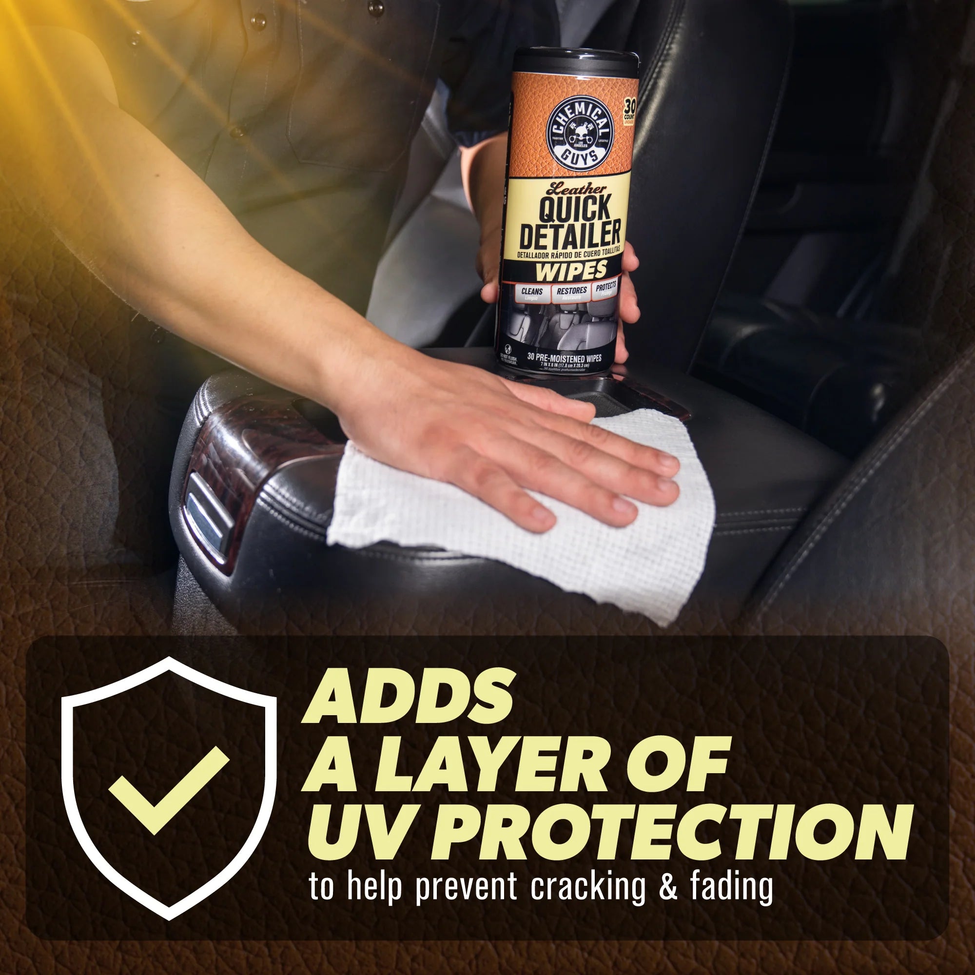 These heavy-duty ready-to-use, pre-moistened wipes feature an advanced high-performance texture weave that easily cleans, restores, and protects leather surfaces in your ride, and elsewhere!