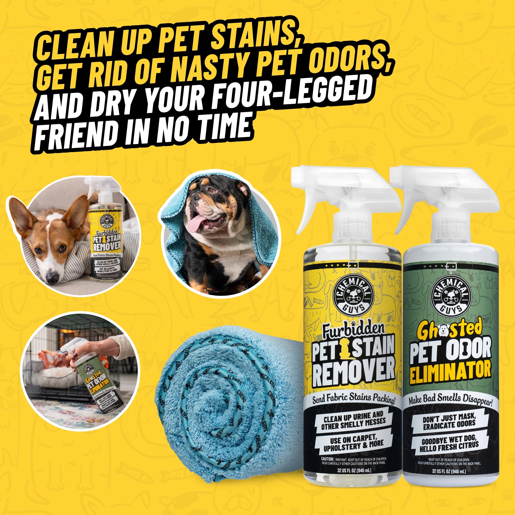 Clean up stubborn pet stains, banish nasty pet odors right at their source, and get your four-legged friend dry as a bone in no time with this set of three premium pet products.