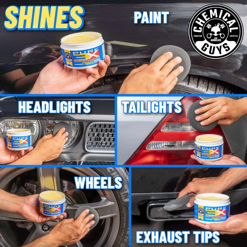 Chemical Guys Pure 3X Hardcore Carnauba Paste Wax is a premium blend of Brazilian white and yellow carnauba wax, delivering a brilliant shine with exceptional clarity and depth. Enhanced with proprietary LTI sealant polymers and amino-functional resins, it offers superior durability and resistance to the elements. This wax also provides natural UV protection, shielding your paintwork from harmful UVA and UVB rays.