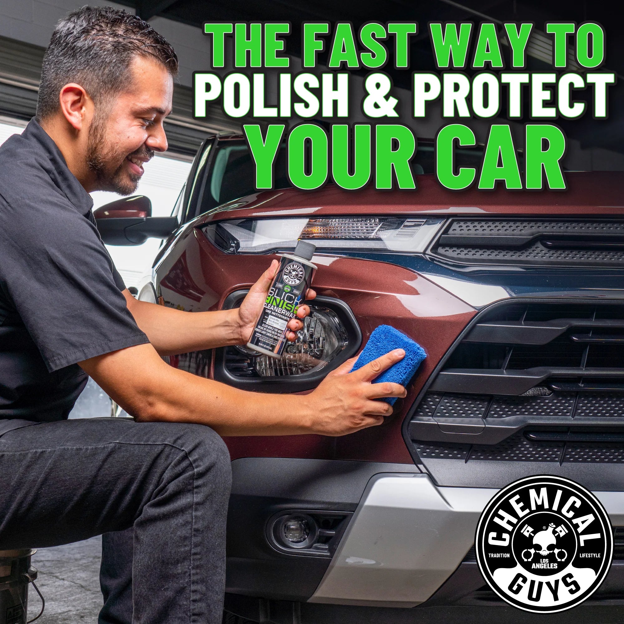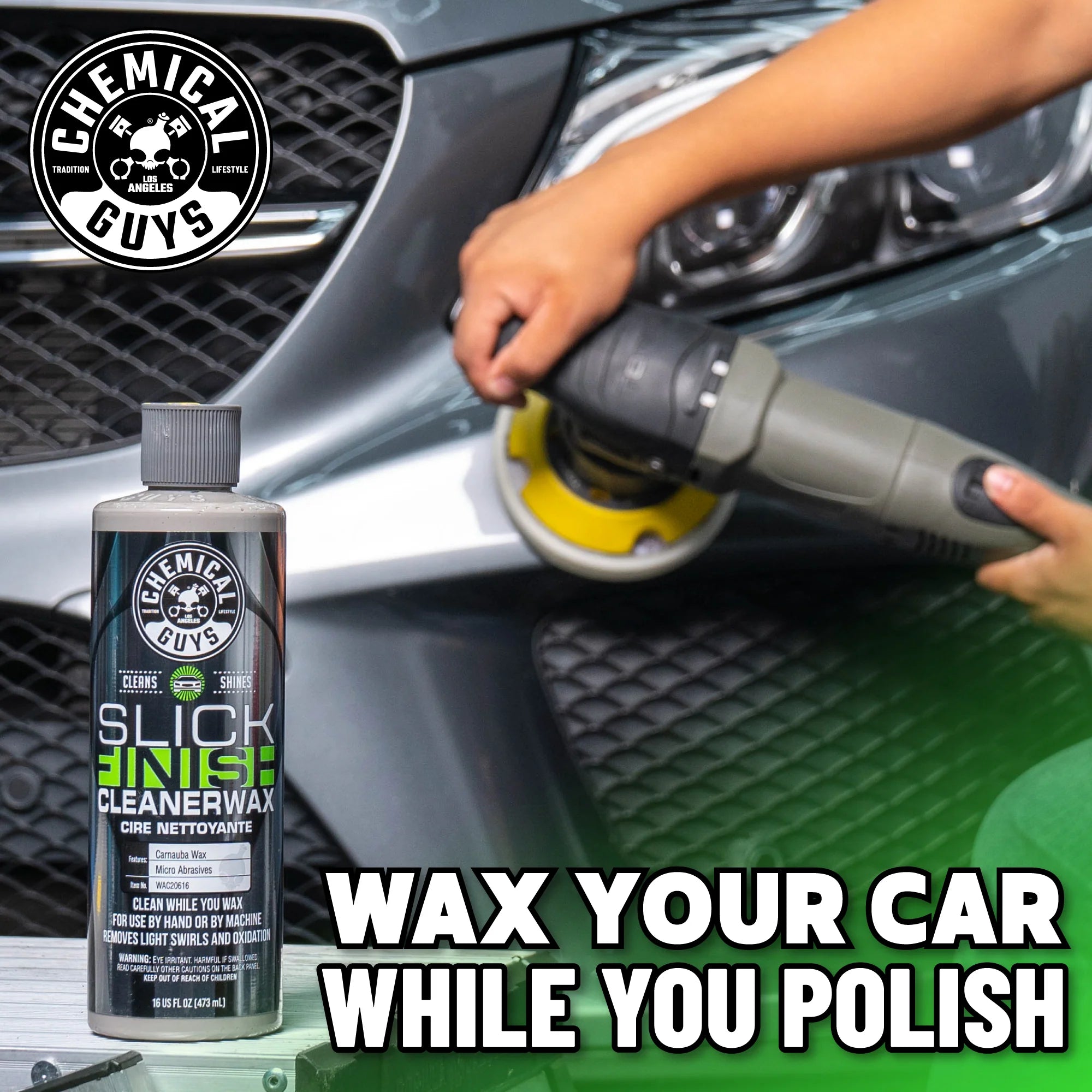 Slick Finish is a hybrid cleaner wax that leaves a brilliant shine, provides durable protection, and removes light swirls, stains, and imperfections—all in one step.