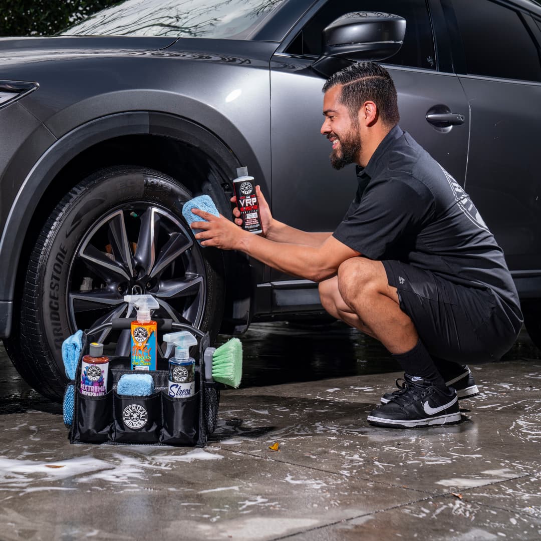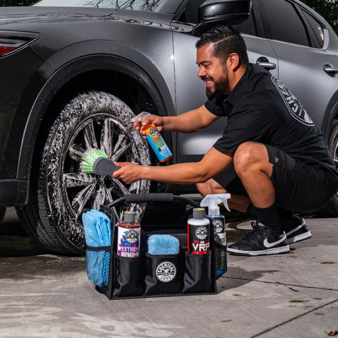 Spray Sticky Citrus Gel onto the wheels and tires, allowing it to sit for several minutes. Use the Wheelie Wheel & Tire Brush to agitate road dirt and dust gently. Then, rinse using a sharp stream of water.