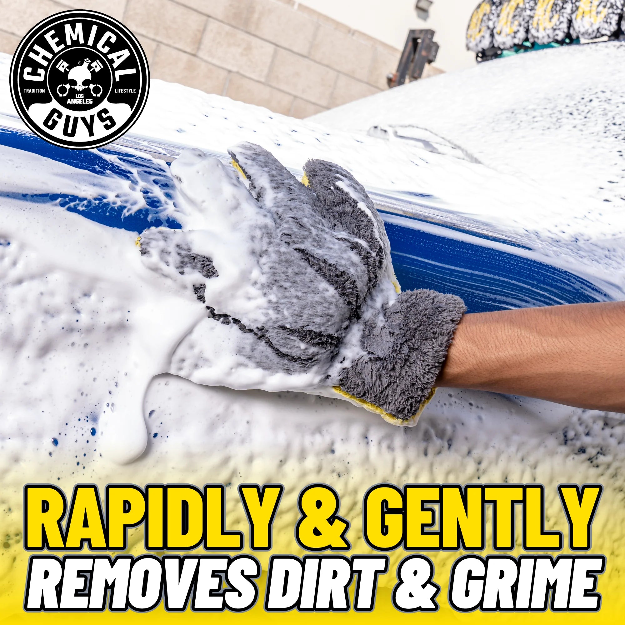 Use the two-bucket method: Fill one bucket with 5 gallons of water and 1-3 oz of Chemical Guys car wash soap and the other with plain water. Rinse your car first, dunk the mitt into the soapy water, then wash in straight lines with the soapy mitt.