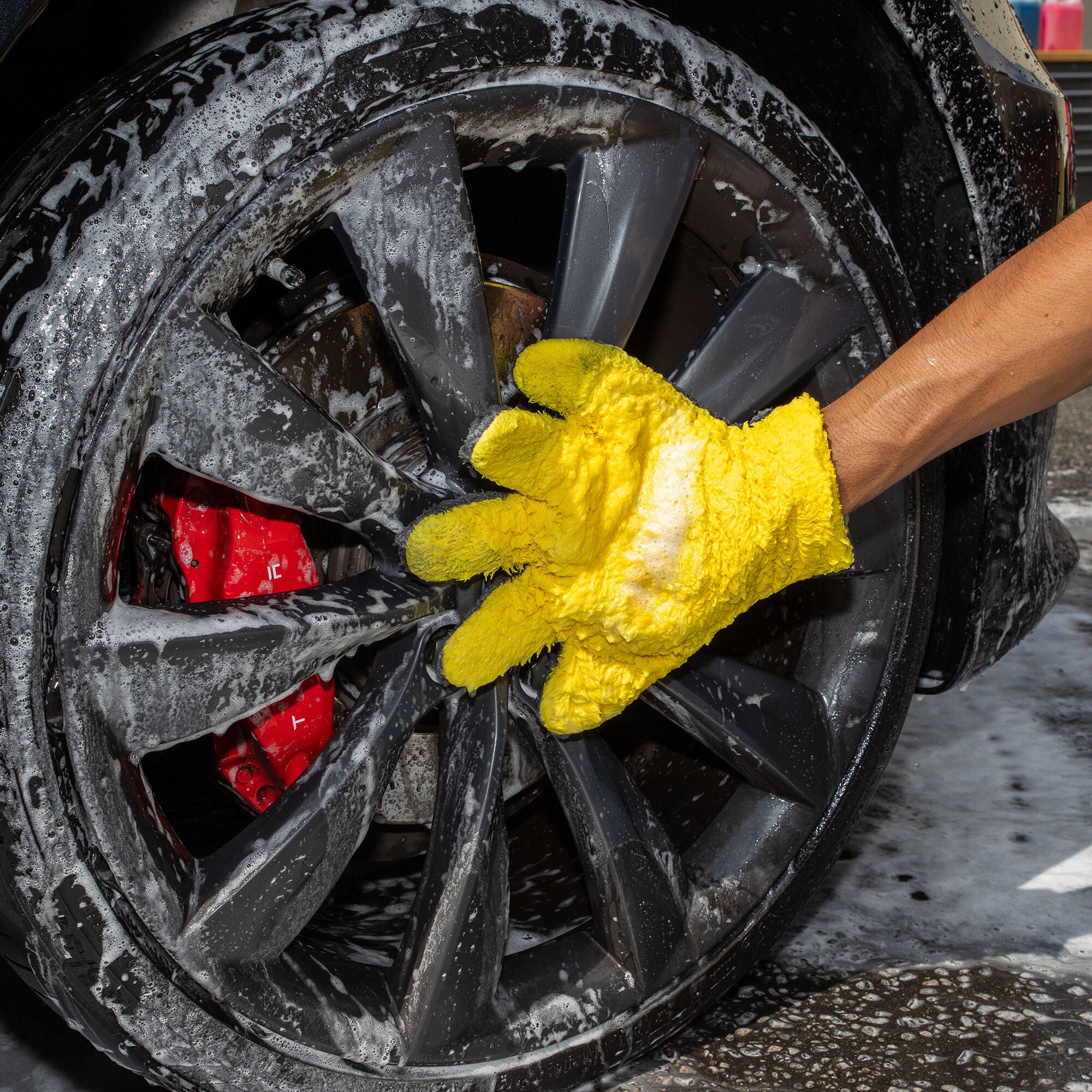 After cleaning a panel or two, dip the dirty mitt in the bucket of plain water to loosen the embedded dirt, then wring it out on the ground. Return to the soap bucket and continue to wash the whole car. Rinse away all soap and dirt from the car, then dry with premium microfiber towels.