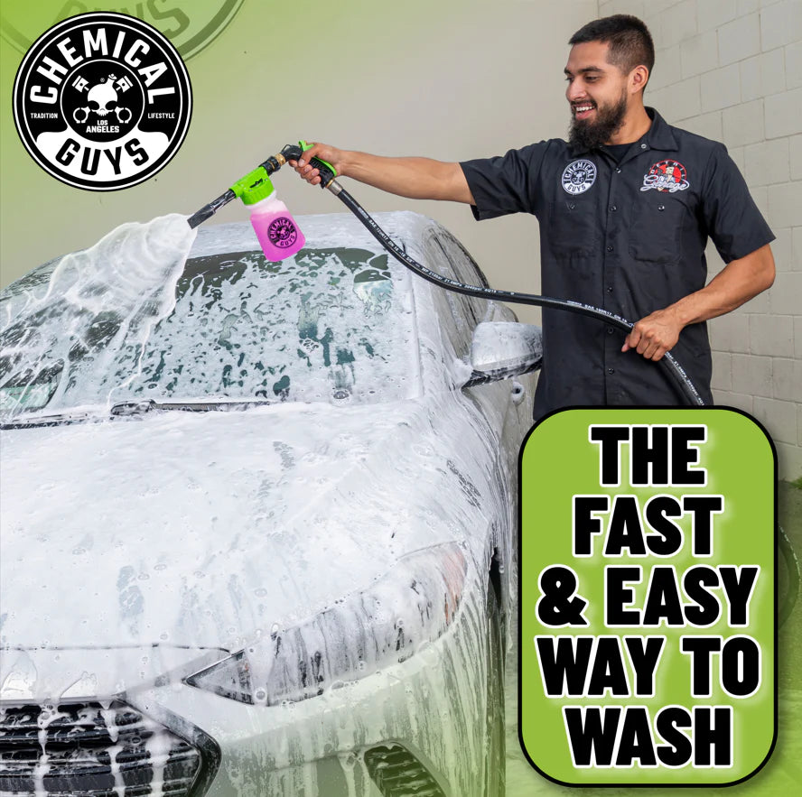 Rinse your vehicle with water to remove loose debris and grime. Fill the soap solution bottle with fresh water, then add 1 - 3 oz of your favorite Chemical Guys car wash soap.