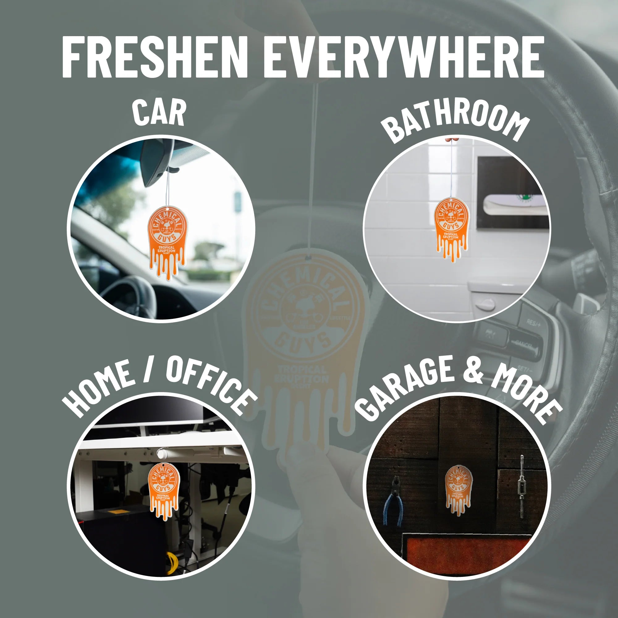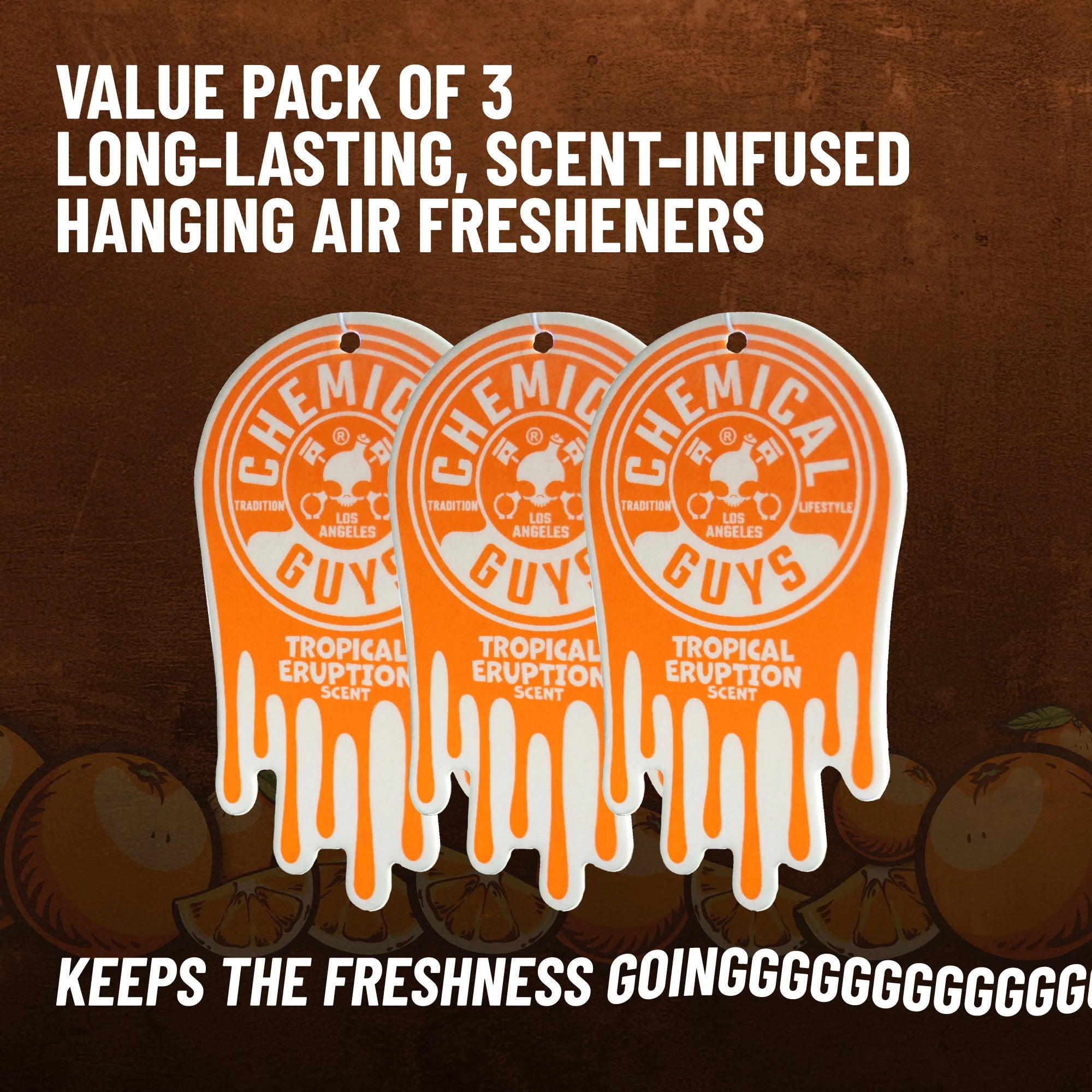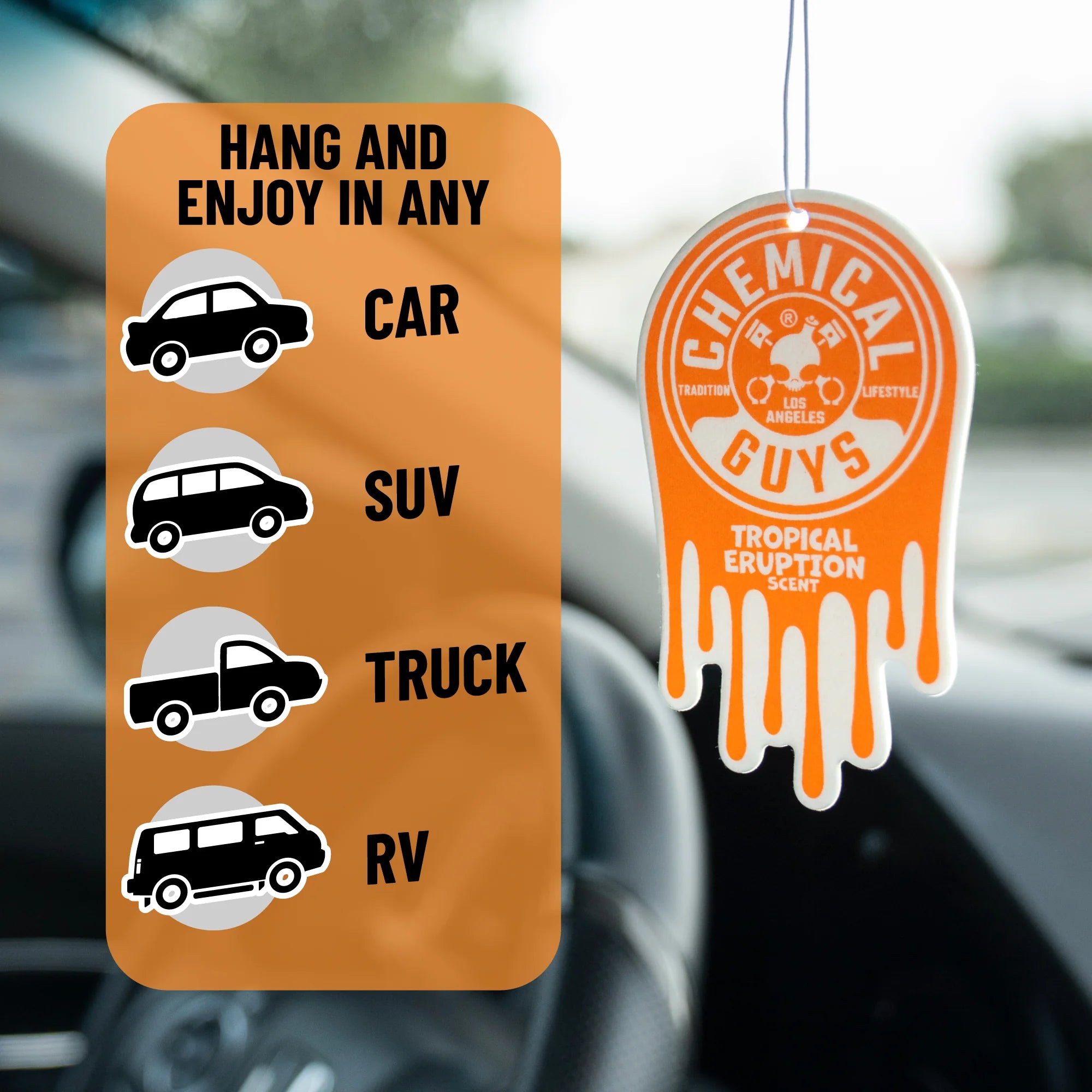 Chemical Guys Tropical Eruption Hanging Air Freshener fills your ride with a bold wave of exotic scents, blending zesty citrus, juicy tropical fruits, and a hint of warm sweetness. Make every drive feel like an escape to a lush volcanic island bursting with intoxicating tropical scents.