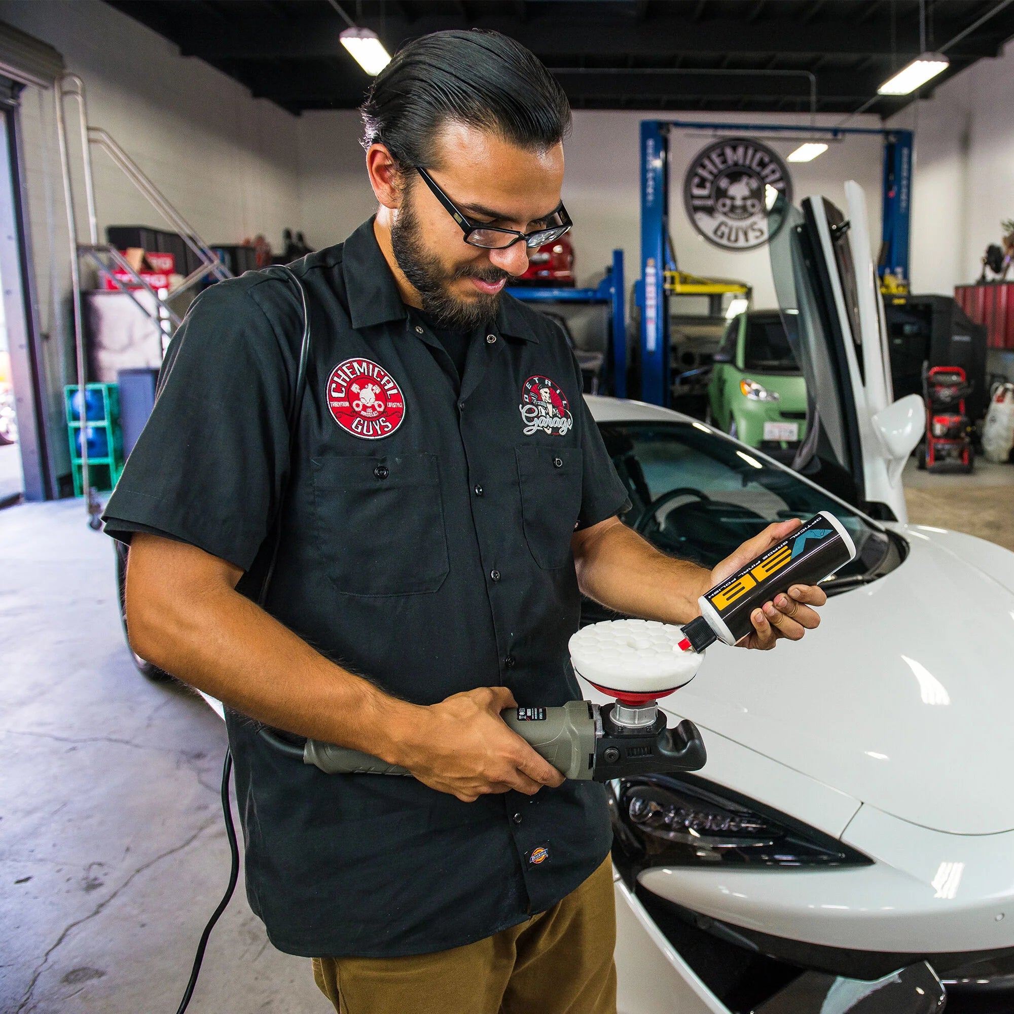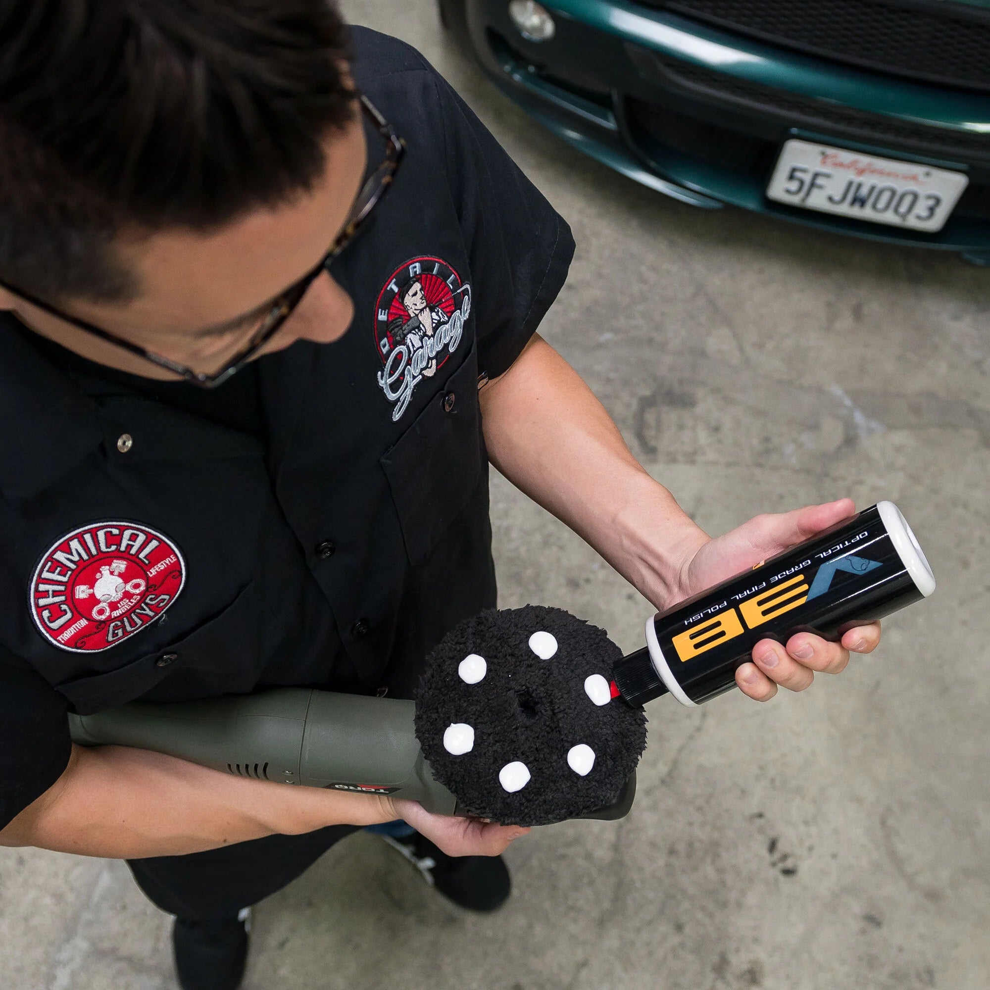 Use a dual-action polisher or rotary polisher. With a dual-action polisher, you’ll use 4-5 drops and moderate pressure until the product becomes clear. With a rotary polisher, you’ll use 4-5 drops and just the weight of the machine until the product becomes clear. Remove residue with a clean microfiber towel. Watch our demo video for a step-by-step demonstration.
