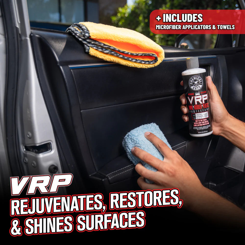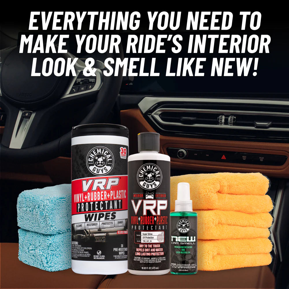 This kit is the easy way to revitalize your ride's interior and leave it looking and smelling like new! Restore, protect, and shine trim, dashboards, and door panels with VRP, while New Car Smell Air Freshener lets you enjoy that fresh-off-the-lot scent with just a spray.