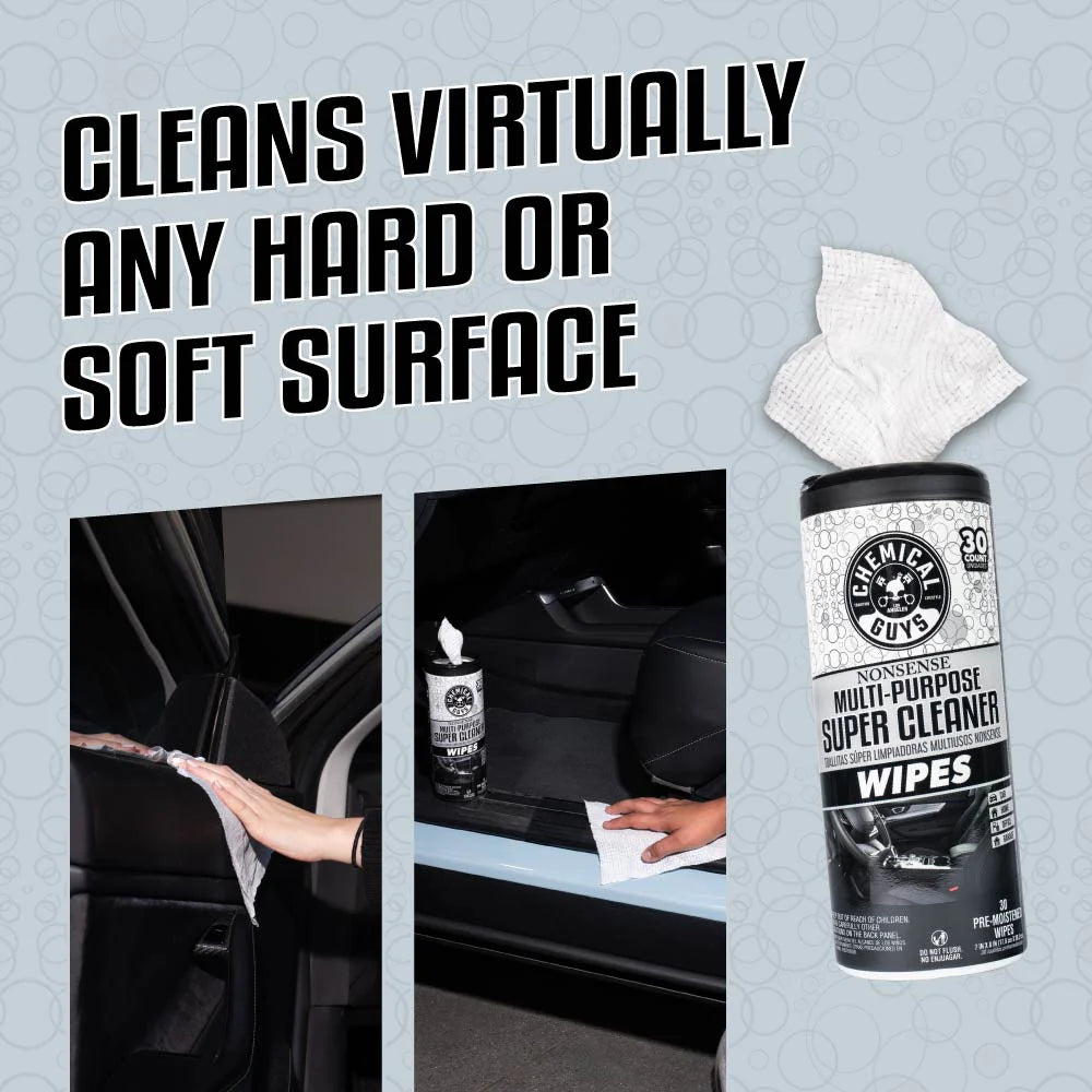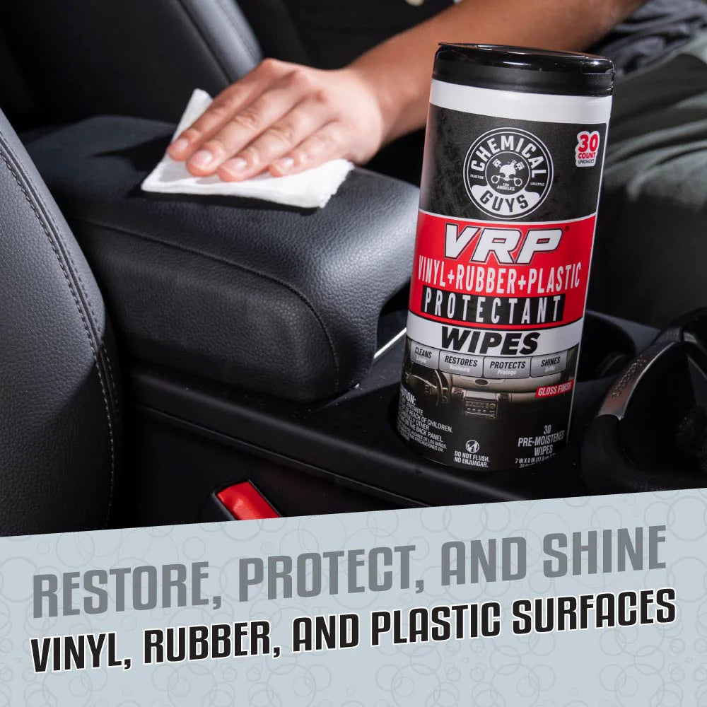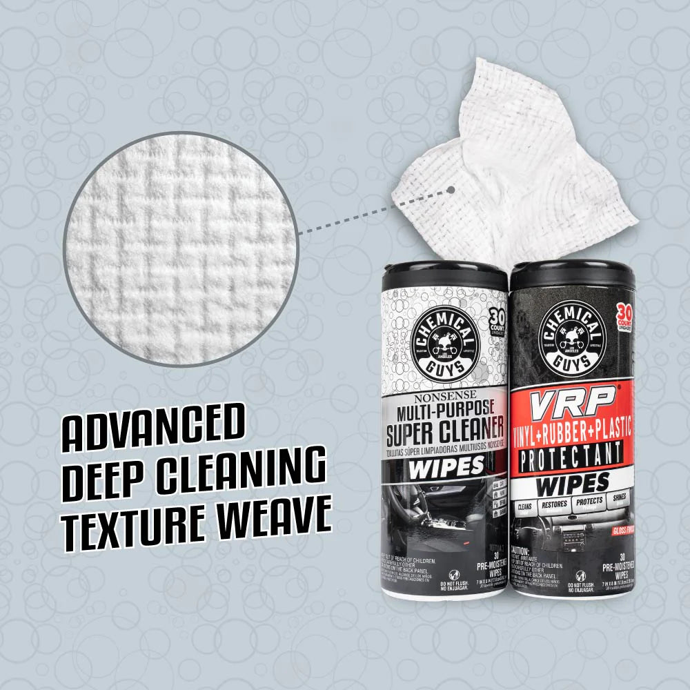 This kit includes two powerful wipes - Nonsense for colorless, odorless cleaning of any car surface, and VRP for cleaning, restoring, and protecting vinyl, rubber, and plastic. Convenient canister packaging helps keep them fresh and ready for on-the-go cleaning and touch-ups.