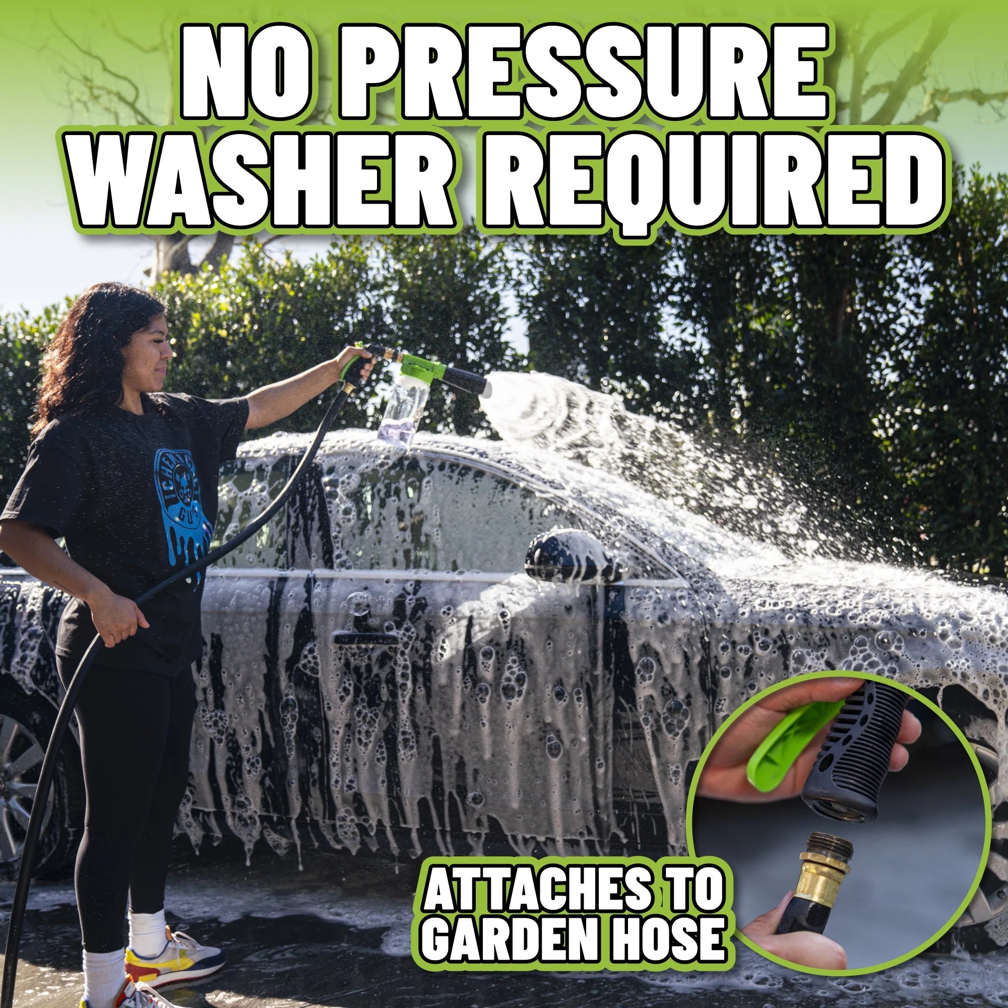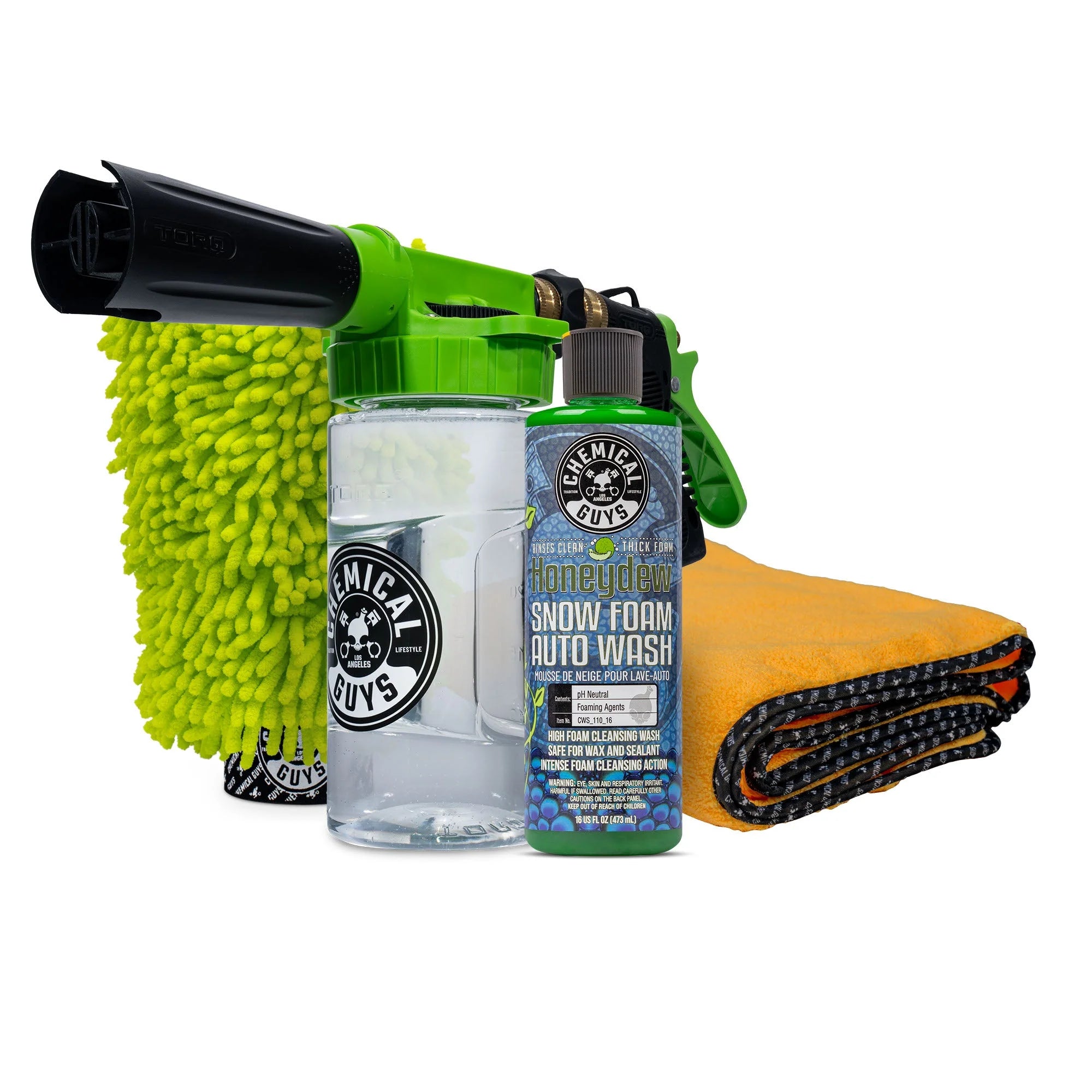 Take your vehicle washes to the next level with the SnowFoam Wash & Dry Kit in your detailing arsenal. Load your Foam Blaster with Honeydew scented shampoo and watch dirt run for cover! Wash mitt included for safe wiping down and a massive Miracle Dryer Towel to dry it all down.